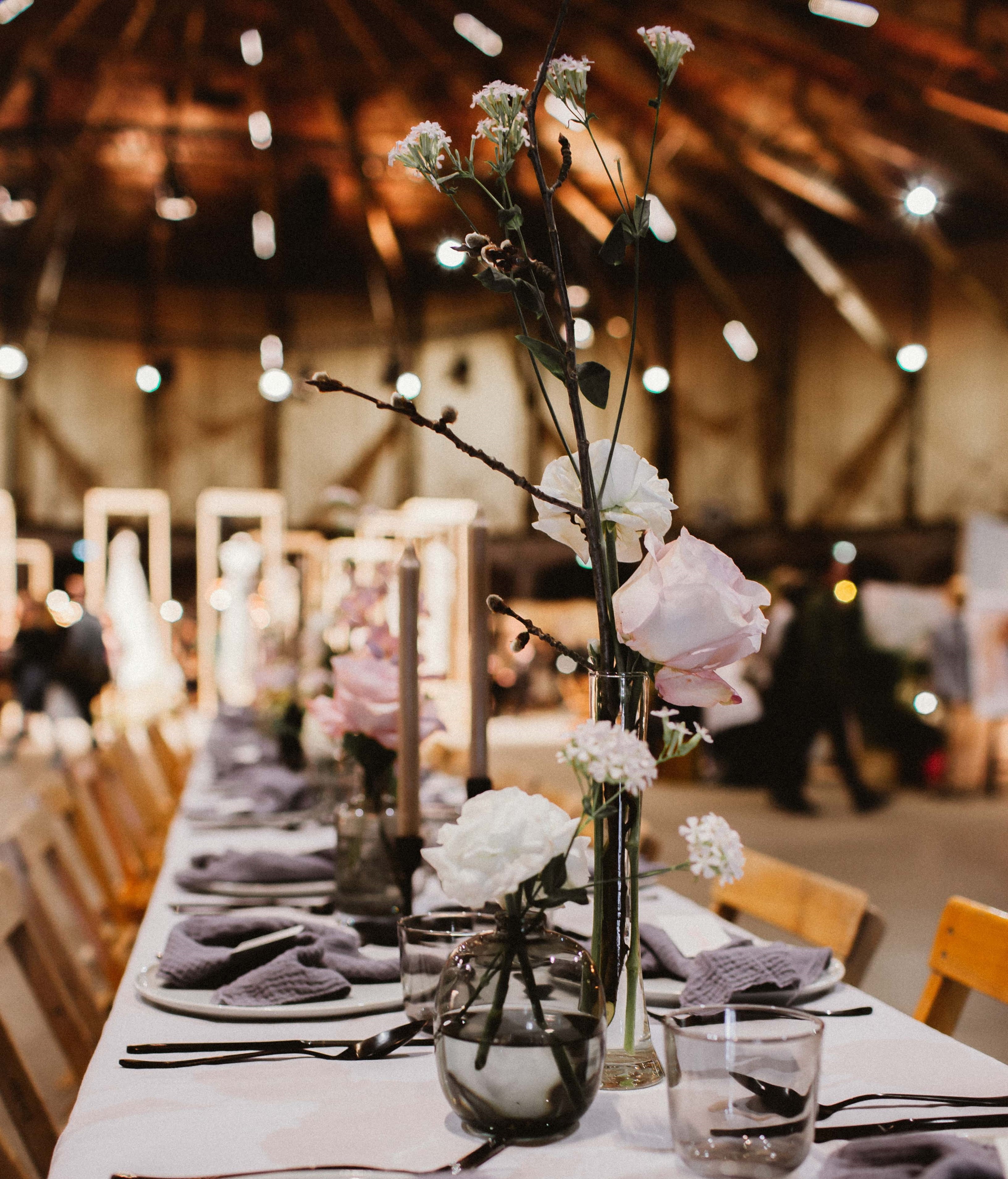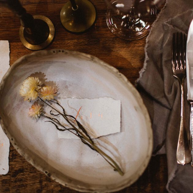 Vervolgens vielen mijn ogen op een waanzinnig gestijlde tafel door Sarto Undici met lila servetten en zwart bestek. Ik wist niet dat zwart bestek überhaupt bestond. De tafel was bedekt met prachtig bloemenwerk van Don Florito. Op elk bord lagen handgeschreven naambordjes voor iedere gast.