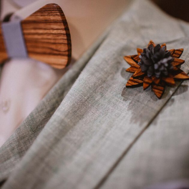 •Stoere houten corsages voor de man (strikje en bloemen).