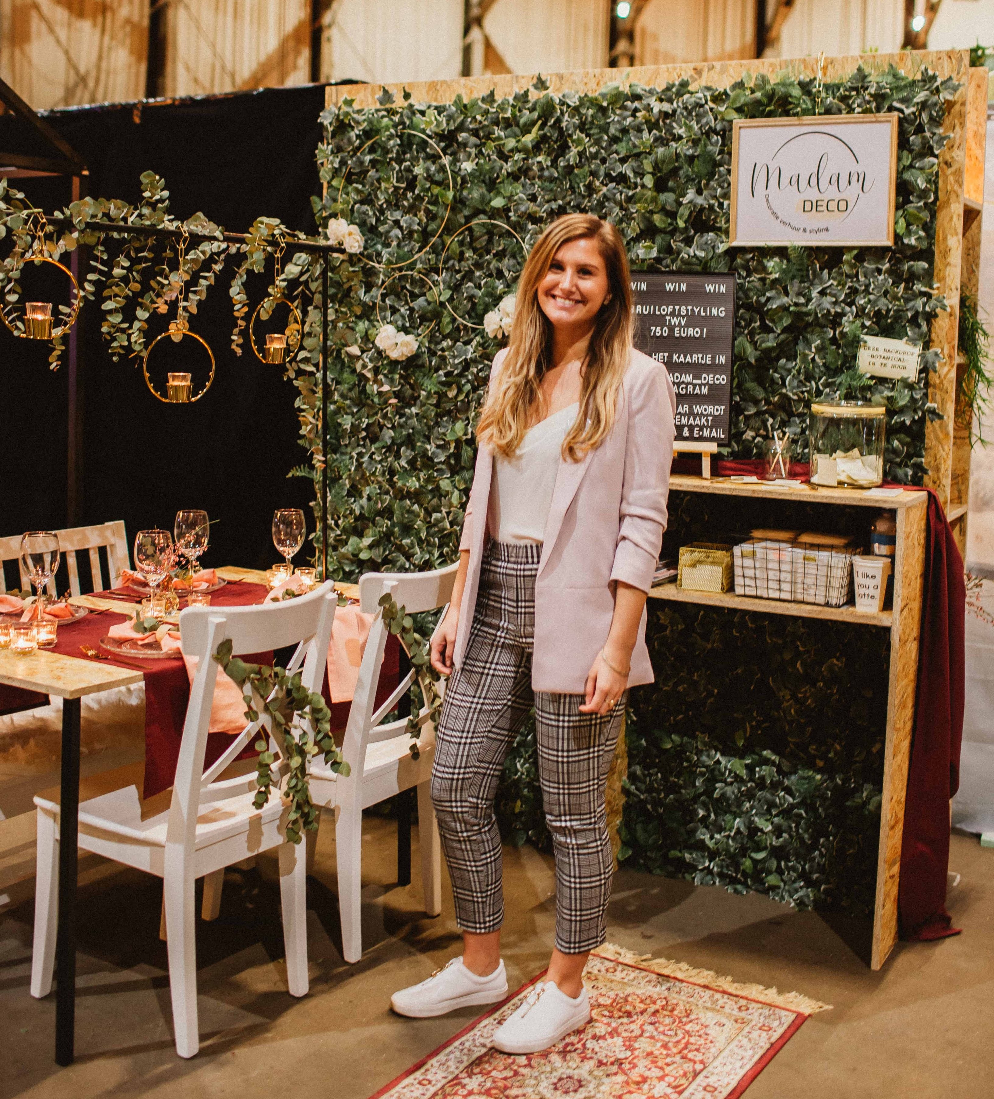 Zo kwam ik MADAM DECO tegen. Zij is van alle markten thuis en kan een prachtig decor voor jouw droombruiloft creëren! Opvallend waren de ronde, gouden kaarsenhangers en het bladwerk boven de dinertafel.