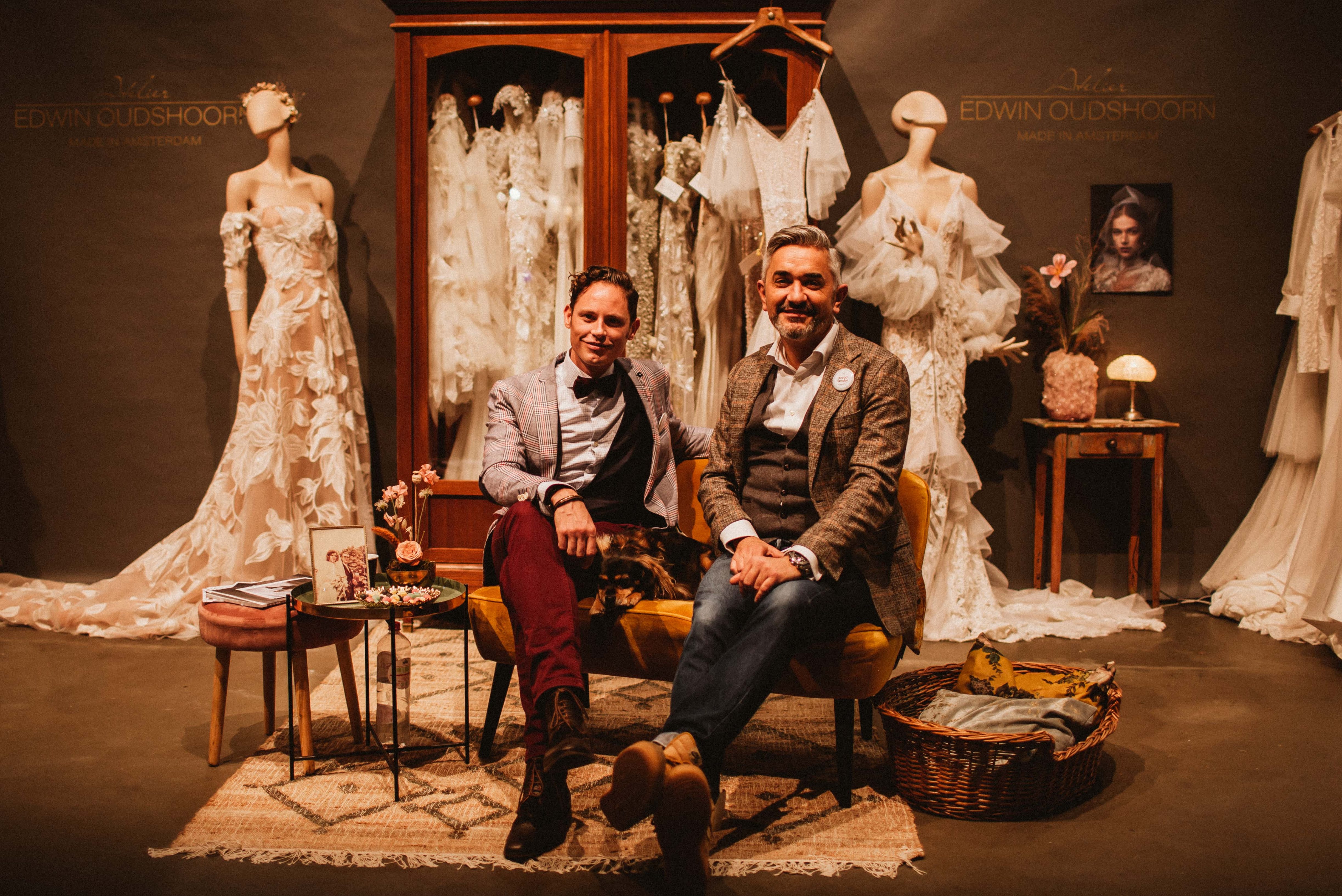 Toen ik vervolgens verder liep zag ik twee tortelduifjes schitteren, bovenop een kast met bruidsjurken. Al snel kwam ik er achter dat ik bij de stand van Edwin Oudshoorn was aangekomen.
